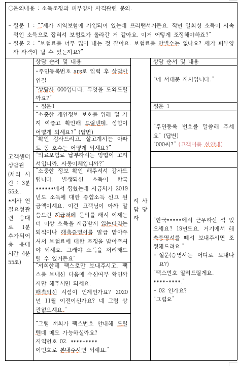 즉 동일한 문의건에 대해 고객센터와 지사의 처리내용은 동일하나, 고객센터에 있어서는 보다 엄격한 안내 대응 매뉴얼이 적용된다는 것을 알 수 있다. 특히 고객이 지사 담당자 연락처를 요청하는 경우는 상담사가 바로 안내를 하는 것이 금지되어 있다. 위의 경우처럼 1차, 2차 방어를 한 뒤에 고객이 계속 요청하는 경우에 한해서 연락처를 알려주거나, 원칙적으로는 상담사가 고객센터내 고객만족팀에 전달하고, 고객만족팀은 공단의 고객상담부로 이관해서 처리하도록 되어 있다.