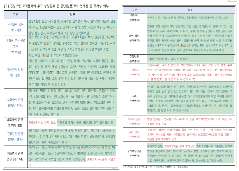 노동자들이 정리한 고객센터의 주요 상담업무 중 고객센터 고유의 업무는 붉은 색(밑줄)으로 표시한 ‘진료확인번호 승인 및 취소’, ‘홈페이지 등 관련 상담 업무’, ‘cKMS’, ‘외국어 및 수어 상담’, ‘장기요양기관 청구 원격 상담’에 불과하다.