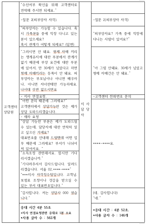 실제 정보를 전달하는 내용이 동일하고 응대시간은 약 5분으로 비슷하나 고객응대에 필요한 사전정보 확인, 쿠션어, 호응어 등의 차이로 인해 고객센터 노동자가 공단(지사) 노동자에 비해 4배 정도 더 많이 말했다. 물론 이는 숙련도의 차이가 있어 일반화할 수 없지만 안내 멘트에 대한 기본 스크립트상 반드시 해야하는 안내와 언급이 있어야 하는 고객센터와 달리 지사 담당자의 경우 보다 여유롭게 업무를 처리했다.