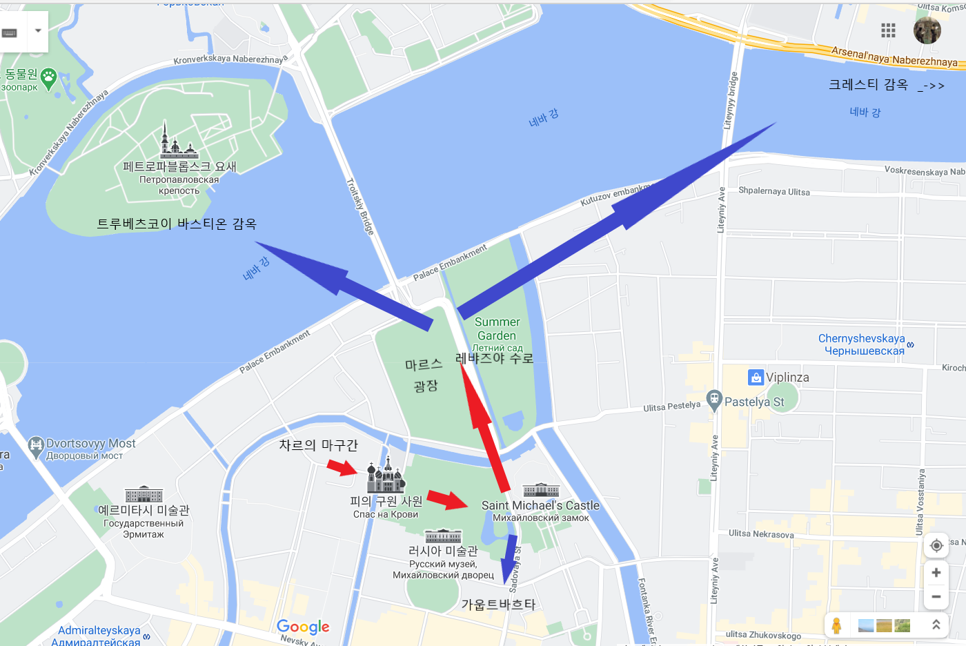 만약 반대로 미하일롭스키 성에서 네바 강 쪽으로 올라가 레뱌즈야 수로를 오른쪽에 끼고 있는 마르스 광장에서 감옥을 본 것이라면 네바 강 너머 두 개의 감옥을 볼 수 있습니다. 첫째, 왼편으로는 페트로파블롭스크 요새에 자리한 트루베츠코이 바스티온 감옥이 보입니다. 둘째, 오른쪽 멀리로는 크레스티 감옥이 보입니다. 지금까지 헤맨 곳들을 방향에 따라 지도에 표시하면 다음과 같습니다(빨간색 화살표는 시적 화자의 이동경로, 파란색 화살표는 시선의 방향을 가리킵니다). 그런데 네바 강 너머의 감옥들은 멀어서 마르스 광장에서도 잘 보이지 않을 듯합니다.