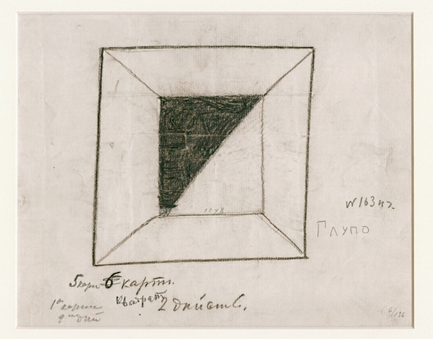 말레비치에게는 검은 사각형 자체를 회화로 재현하는 것보다 그것을 그려내는 행위와 의미가 더 중요했을지 모른다. 재미있는 점은 <태양에 대한 승리>가 상트페테르부르크에서 상연되던 1913년 당시 검은 사각형 스케치가 실제로 존재했는지 분명하지 않다는 점이다. 그럼에도 저자는 "말레비치가 <검은 정사각형>의 탄생을 1913년으로 정할 권리가 있다"[15]고 말한다. 1910년대에 각축을 벌이던 비대상성 예술계 상황을 차치하더라도, 말레비치가 생각했던 검은 사각형이 가진 속성을 생각하면 그것이 물질로서 정말 존재하는지는 문제가 되지 않기 때문이다.