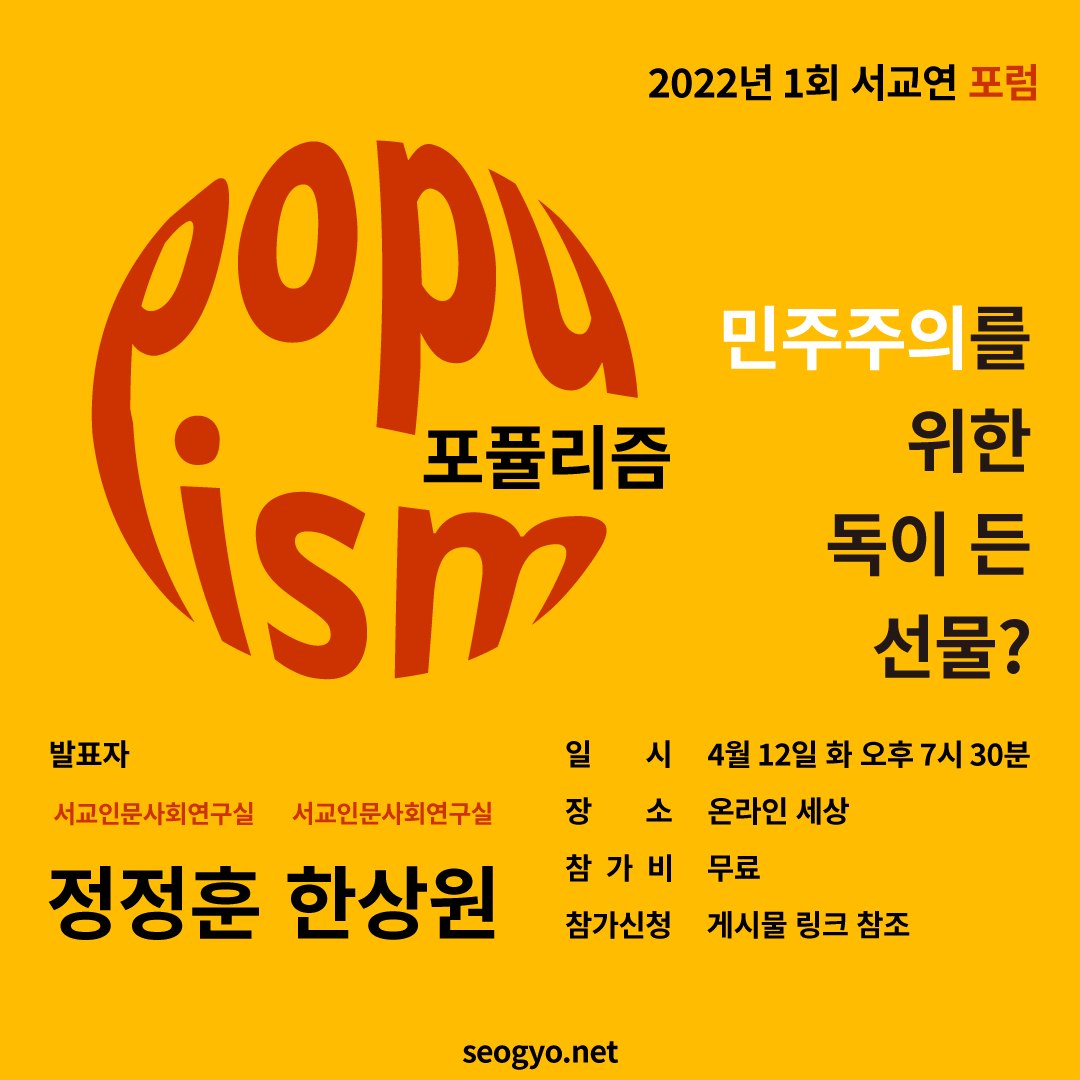 <서교연포럼> "체제전환을 위한 정치학적 모색 1: 포퓰리즘, 민주주의를 위한 독이 든 선물?"
