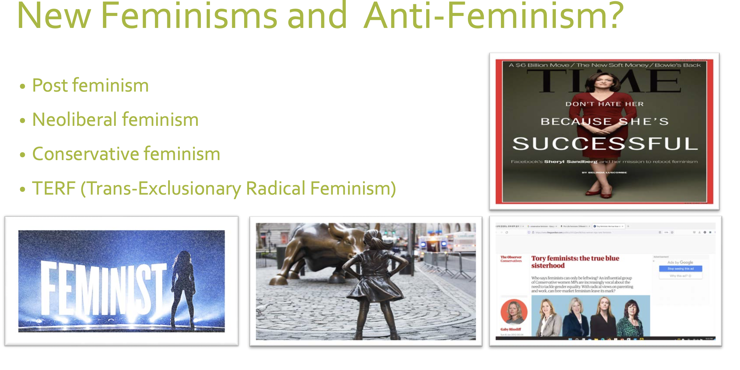 새로운 논의들보다는 굉장히 이미 많이 반복된 얘기들이긴 합니다. 페미니즘의 새로운 조합들인 거죠. 그러니까 이제 무슨 얘기냐면 페미니즘은 이미 굉장히 많은 역사들을 가지고 있는 거죠. 그럼에도 새로운 현상이 또 여전히 새롭게 등장하는데 그 새로움이라고 하는 게 기존의 레퍼런스들을 새롭게 조합하는 방식으로 일어나고 있는 게 최근의 포스트 페미니즘이든 보수적 페미니즘 혹은 트랜스 배제적인 페미니즘이든 여러 가지 이름들을 갖고 나타나고 있죠.