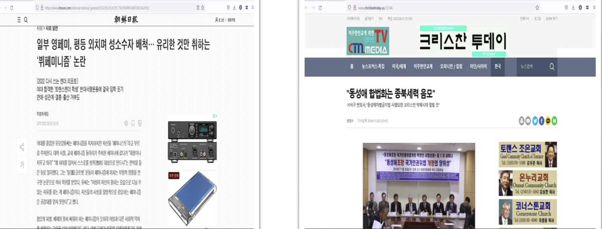 이건 옛날 뉴스예요. 옛날 뉴스인데 아무튼 ‘종북 게이’라고 하는 그 조합이 생겨난 시점으로 약간 되돌아서 올라가 볼 때, 우리가 기독교와 반동성애의 운동과 정치권의 어떤 조합 이런 것들을 좀 볼 수 있지 않을까요?
