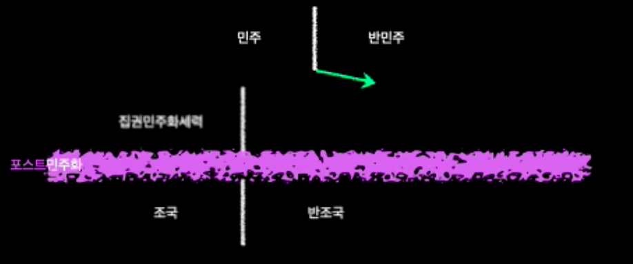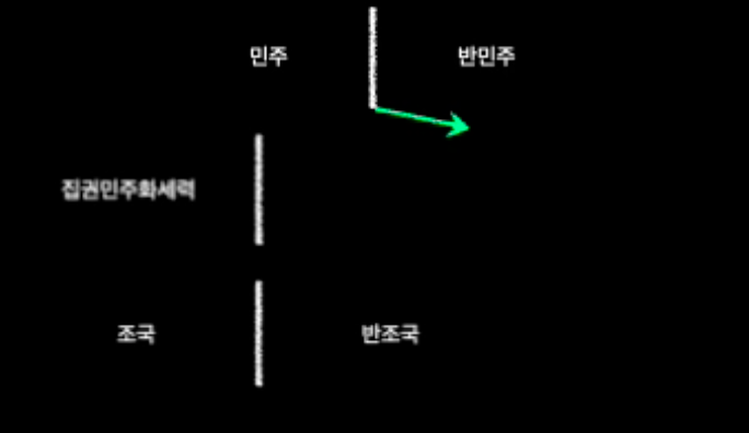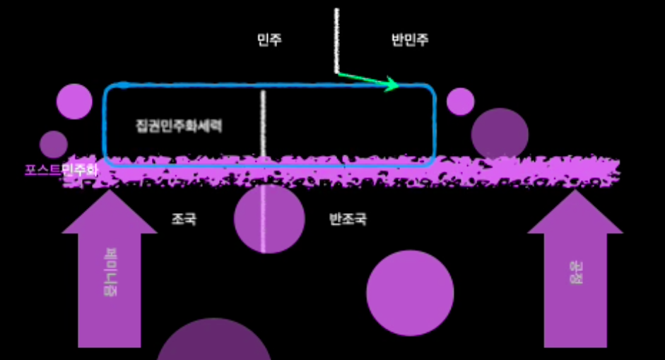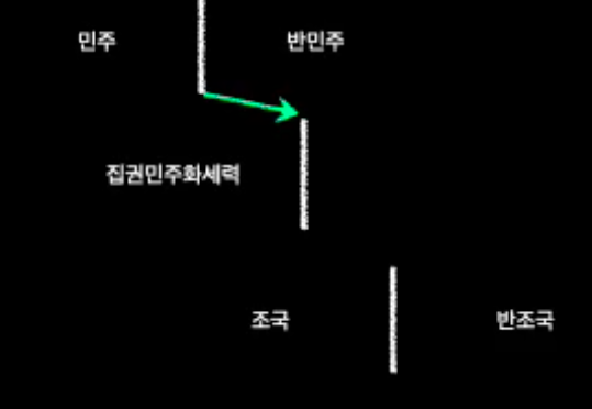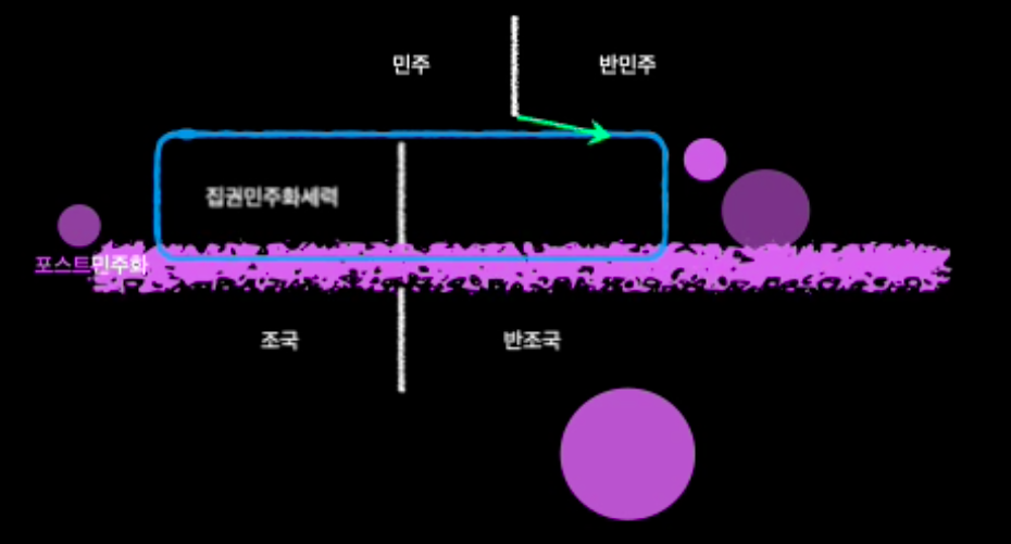 [그림 해설] 여기 그림에 민주/반민주의의 구도가 있는데요. 여기에 집권 민주화 세력이 있고. 녹색 화살표는 민주화 운동이구요. 민주화 운동과 87년 체제, 그리고 정당정치를 통해서, 집권 민주화 세력이 헤게모니를 확장하죠. 이 과정에서 민주 vs 반민주 구도는 강고해 집니다. 이 상태에서 집권 민주화세력이 판단한 건, ‘조국 대 반조국의 전선으로 가면 헤게모니가 확장될 것’이라는 예측이죠. 그림 상에서 이제 ‘오른편으로 확장될 것이다’라는 걸 노린 겁니다. 그런데 뚜껑을 열어보니 ‘반 조국’이 왼쪽으로 이동을 하는 거예요. 전선이 왼쪽으로 이동을 하면 어떻게 됩니까? 이제 집권 민주화 세력이 가지고 있는 전선이 딸려 들어왔어요. 같이 딸려 들어오면서 축소가 되죠. 그러니까 이제 민주에서 왼쪽으로 선이 축소가 되는 거예요. 그러니까 헤게모니가 줄었다. 세력이 줄어들었다. 이렇게 쉽게 생각하시면 될 것 같아요.