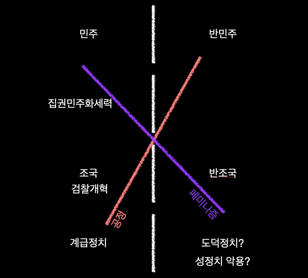 그림은 민주/반민주 구도를 표현한 거고요. 저는 집권 민주화 세력과 비집권 민주화 세력을 구분했습니다. 집권 민주화 세력이 민주/반민주 구도를 이어받죠. 근데 집권 민주화 세력의 입장에서 봤을 때는 조국과 검찰 개혁이 이제 ‘우리 편’이고 그렇죠. 반조국은 ‘반대 편’이고 이렇게 된 거죠.