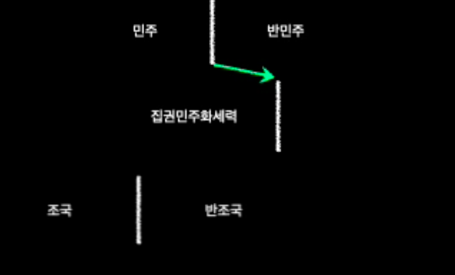 [그림 해설] 여기 그림에 민주/반민주의의 구도가 있는데요. 여기에 집권 민주화 세력이 있고. 녹색 화살표는 민주화 운동이구요. 민주화 운동과 87년 체제, 그리고 정당정치를 통해서, 집권 민주화 세력이 헤게모니를 확장하죠. 이 과정에서 민주 vs 반민주 구도는 강고해 집니다. 이 상태에서 집권 민주화세력이 판단한 건, ‘조국 대 반조국의 전선으로 가면 헤게모니가 확장될 것’이라는 예측이죠. 그림 상에서 이제 ‘오른편으로 확장될 것이다’라는 걸 노린 겁니다. 그런데 뚜껑을 열어보니 ‘반 조국’이 왼쪽으로 이동을 하는 거예요. 전선이 왼쪽으로 이동을 하면 어떻게 됩니까? 이제 집권 민주화 세력이 가지고 있는 전선이 딸려 들어왔어요. 같이 딸려 들어오면서 축소가 되죠. 그러니까 이제 민주에서 왼쪽으로 선이 축소가 되는 거예요. 그러니까 헤게모니가 줄었다. 세력이 줄어들었다. 이렇게 쉽게 생각하시면 될 것 같아요.
