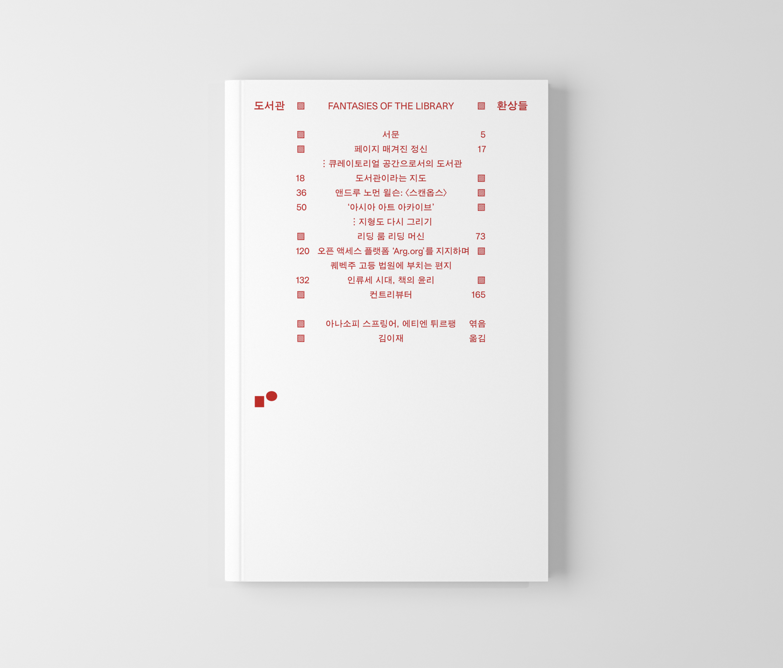 하나의 체계처럼 보였던 요소가 체계로 설명할 수 없는 지경에 이르러 다시 질문하게 됐다. 나는 디자인이 하나의 목표를 위해 체계를 만드는 행위라 믿었고 이 글을 쓰면서 믿음을 수정하고 싶지 않았기 때문에 통일된 체계로 이 책을 설명하고자 했다. 그러나 결론을 내리지 못한 채로 표지를 덮어야 했다. 그러자 처음에 단순히 전시장 벽처럼 보였던 종이가 다르게 느껴졌다. 알 수 없는 체계가 믿었던 모든 것을 다시 의심하게 했다. 그때 거칠고 빳빳한 표지는 독자를 환상으로 호출한다. 표지에 빛나는 틈을 낸 적박은 마치 양피지 살갗을 긁어내 붉은 잉크로 채우던 중세 코덱스의 주서를 닮았다.7그러고 보니 페이지 번호 반대편 빗금 친 네모들이 같은 모양임을 깨닫는다. 양 끝으로 멀어진 도서관과 환상들은 이 책에서 구별할 수 있는 개념일까? 디자인은 정말 체계를 만드는 행위일까? 그러고 보면 책과 도서관에 대한 이 책의 관계는 메타적이면서 동시에 하나의 주석일 뿐이다. 그런데 이 책이 도서관에 꽂히는 모습을 상상하면 이 책과 도서관의 관계는 계속해서 반전된다. 책이 도서관을 담는 걸까, 도서관이 책을 담는 걸까?