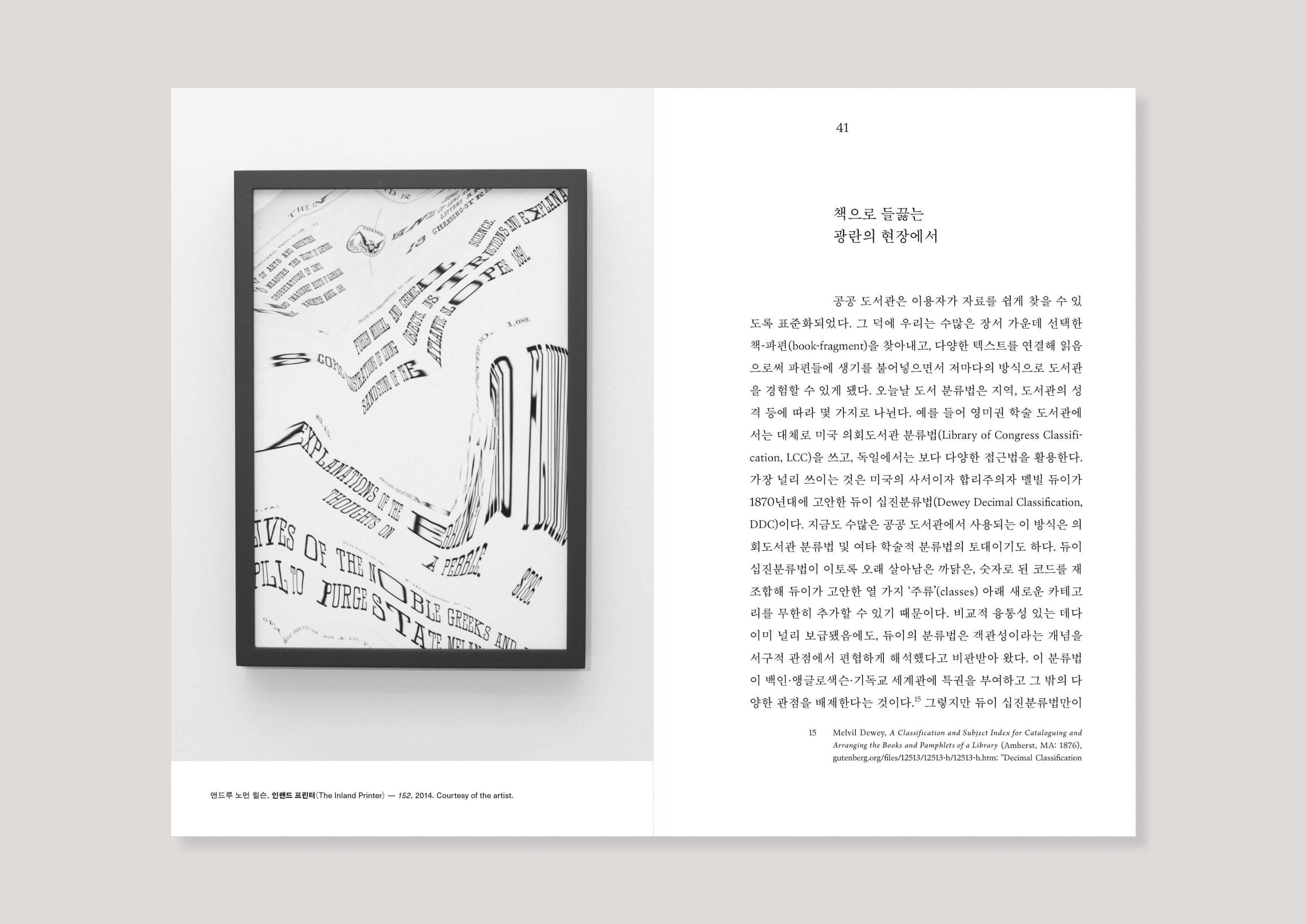 ‘fantasy’의 어원인 그리스어 φαντασία는 ‘상상, 이미지’를 뜻한다. 환상(fantasy)의 영역인 공간은 숫자로 매겨질 수 없다. 이 책에서는 ‘공간’과 ‘장소’를 페이지 번호로 구분한다. 숫자는 순서를 매겨 질서를 만들고 동선을 안내한다. 이미지가 끼어드는 페이지인 〈스캔옵스〉와 비주얼 에세이에는 페이지 번호가 등장하지 않는다. 디자이너에게 이 책에서 모든 이미지는 이성의 틈새를 파고드는 환상(fantasy)인 셈이다. “공간은 본디 장소로부터 빠져나가는 혹은 열리는 것이다. 거꾸로 말하자면, ‘지금 여기’를 빠져나가 ‘다음 거기’에서 열리지 않는 것은 공간이 아니다. 집처럼 우리를 안온케 하는, 구체적으로 규정지어져 질서 잡힌 ‘장소’와 달리, ‘공간’은 무한하고 추상적이어서 규정할 수 없다.”고 건축 비평가 이종건은 말한다.6 이러한 의미에서 이 책은 장소보다 공간에 가깝다. 일직선으로 읽히기 거부하는 이 책은 파편으로 지각되며 전체를 파악하기 힘들다. ‘책’이라는 오랜 매체는 지금까지 많은 시도를 해왔다. 단순히 왼쪽과 오른쪽 페이지가 나란히 이어지지 않는다고 해서, 서로 다른 레이아웃과 글꼴이 쓰였다고 해서, 반표제지부터 페이지 번호가 시작하고 이미지가 등장하는 페이지에는 페이지 번호가 존재하지 않는다고 해서 이 책이 실험적인 것은 아니다. 이와 같은 구성을 이 책에서 처음 본다면 생소할 수는 있겠지만 모두 이전에 시도된 형식일 뿐이다.