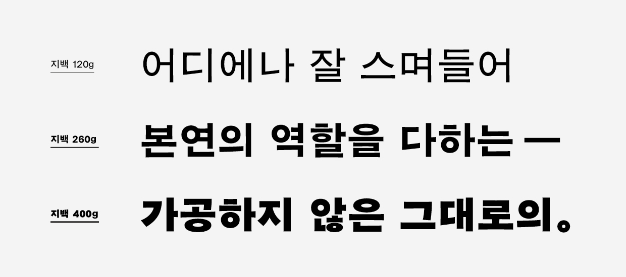 반면에 지백이라는 이름은 대다수 글꼴 이름과 다른 성격을 보여준다. 글꼴은 보통 흰 종이에 검은 글자로 인쇄된다. 독자에게 흰 공간은 후경으로, 검은 글자는 전경으로 인식된다. 물론 글자를 그릴 때 디자이너는 글자의 흰 공간을 검은 공간만큼 중요하게 생각한다. 그러나 글꼴 이름은 대체로 검은 공간이 차지하는 형태를 따른다. 글꼴 이름 몇 가지만 떠올려봐도 형태든 디자이너 이름이든 배경이 되는 시대나 장소든 검은 공간을 생각하며 지은 이름이 많다는 사실을 알 수 있다. 이때 “종이 본연의 백색”이라는 지백의 의미를 다시 떠올려보면 자기를 드러내기보다 자기가 엮이는 공간, 즉 다른 존재와의 필연적 엮임을 상정하고 있음에 감탄하게 된다. 저자의 자리를 엮은이로 채우는 이 책의 표지가 지백의 겸허함을 헤아리지 않기란 불가능하다.