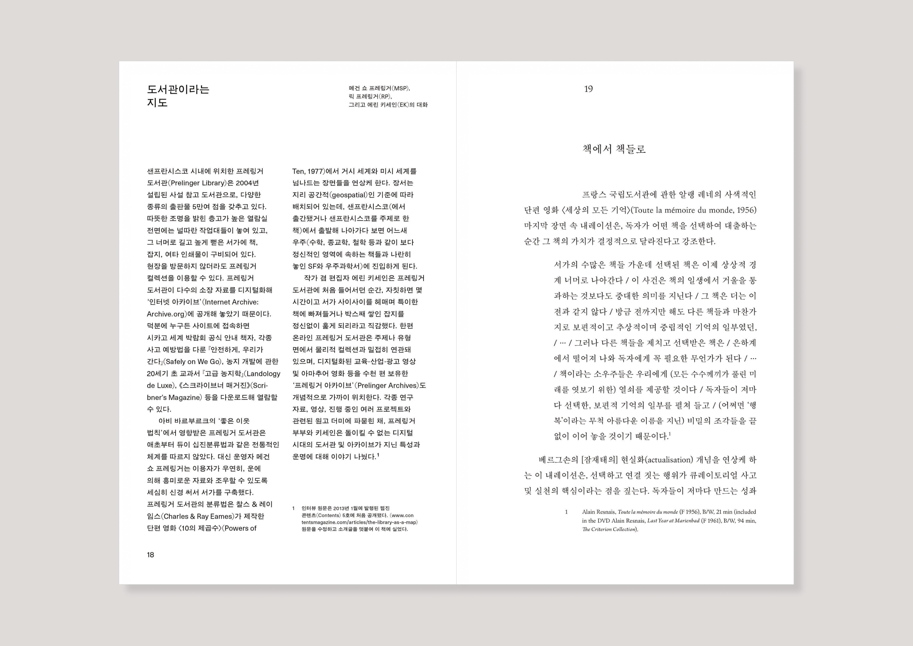 그런 점에서 『도서관 환상들』의 디자인은 형식과 개념(내용)을 나누는 이분법에 저항한다. 독자의 시선에서 편집저작물의 디자인과 편집을 구별하기 쉽지 않지만, 내지를 원서와 비교해보면 원서의 인상을 유지하려는 의도가 느껴진다. 인터뷰가 등장하는 왼쪽 페이지가 2단, 에세이가 자리하는 오른쪽 페이지가 1단으로 짜여 있는 점, 그리고 각각 왼쪽에 산세리프, 오른쪽에 세리프 글꼴을 사용한 점이 원서와 유사하다. 그러나 소개 글과 대화가 각각 1단과 2단인 원서와 달리, 번역서는 소개 글과 대화 모두 2단으로 통일했다. 두 개의 열이 흐르는 인터뷰는 한 개의 열로 구성된 에세이와 극명한 시각적 대비를 이룬다. 인터뷰 소개 글의 위계를 대화에 참여하는 한 명의 화자로 만듦으로써 2단 구성은 인터뷰 저자보다 구성원으로서의 성격을 강화하고 화자의 복수성을 드러낸다.