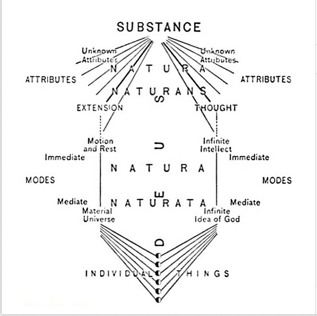 사실 이것은 매우 충격적인 사고방식입니다. “양태”의 라틴어 원어는 모두스(modus)인데, 이것은 원래 ‘척도’라는 뜻 이외에도 ‘방식’이나 ‘태도’ 등의 뜻을 지니고 있습니다. 따라서 원래 모두스라는 용어는 어떤 실재나 사물을 가리키는 용어가 아니라 그 사물의 모양이나 존재방식, 행위방식 등을 가리키는 용어입니다. 그럼에도 스피노자는 인간을 포함하여 존재하는 모든 사물은 양태들입니다. 여기 있는 책상이나 의자, 건물, 나무, 그리고 지구 전체도 양태이며, 더 나아가 관념과 정신 역시 하나의 양태입니다. 그러면서 스피노자는 『윤리학』 1부 정의 3에서 실체를 “자신 안에 있고 자신에 의해 인식되는 것”이라고 정의하고, 정의 5에서는 양태를 “다른 것 안에 있고 다른 것을 통해 인식되는 것”이라고 정의합니다. 실체와 양태에 대한 두 개의 정의의 내용이 서로 대조를 이루는 데서 알 수 있듯이, 실체가 자율적이고 자립적인 존재자를 가리킨다면, 양태는 기본적으로 타율적이고 의존적인 존재자를 나타냅니다. 그리고 스피노자에게는 오직 신 또는 우주 전체만이 실체이고, 우주 안에 존재하는 모든 사물은 양태이기 때문에, 결론적으로 인간을 포함한 모든 사물은 타율적이고 의존적인 존재자라고 말할 수 있습니다.