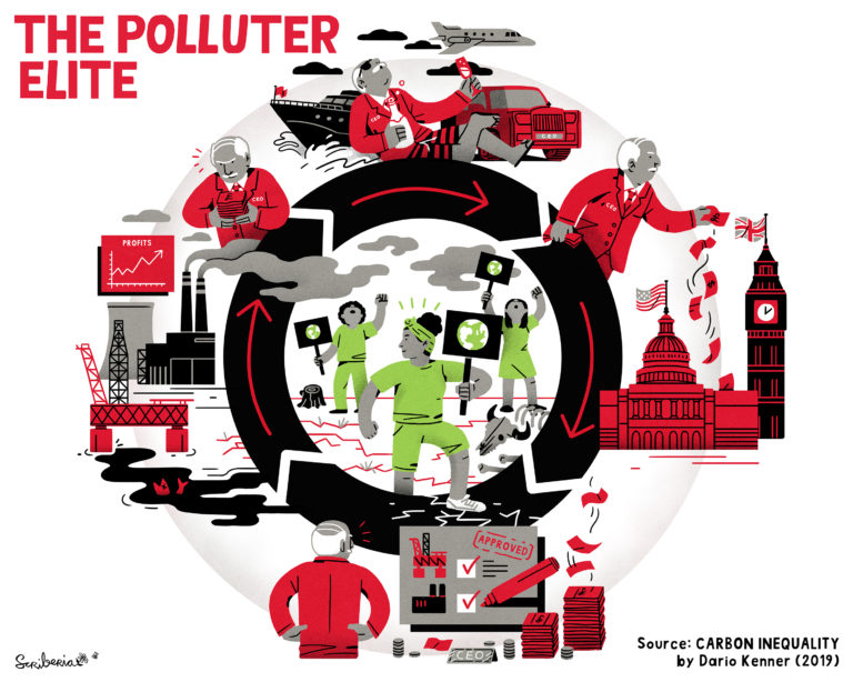이러한 탄소 배출량의 격차는 국가 간에만 나타나는 것이 아니라 한 국가 내 부유층과 빈곤층 사이에서도 나타나는 문제이다. 2015년 Oxfam 보고서에 따르면, 전 세계 온실가스 배출량의 절반 이상이 세계 소득수준 상위 10%의 계층에서 발생하며, 이는 전 세계에서 가장 가난한 약 35억 명의 인구가 배출하는 양의 다섯 배에 해당하고, 소득 수준 상위 1%는 하위 10%보다 탄소 배출량이 175배 많다고 한다.[7] 유사하게, 영국에서는 영국 소득수준 상위 1%의 영국인들의 연간 탄소 배출량은 하위 10%의 영국인들이 무려 20년 넘게 배출한 양과 맞먹는다고 보았다.[8] 소득수준에 따라 이렇게 탄소 배출량이 차이가 나는 이유는 부유층의 경우 빈곤층과 비교했을 때 더 큰 집을 소유하고, 비행기와 자동차를 훨씬 더 많이 타는 등 자원 집약적인 삶을 누리기 때문이다. 오염의 주범인 엘리트층(polluting elite)의 막대한 책임에도 불구하고 기후변화로 인한 피해가 빈곤층에게 더욱더 극대하게 나타나는 현상은 기후 변화의 부정의 문제를 여실히 보여준다.