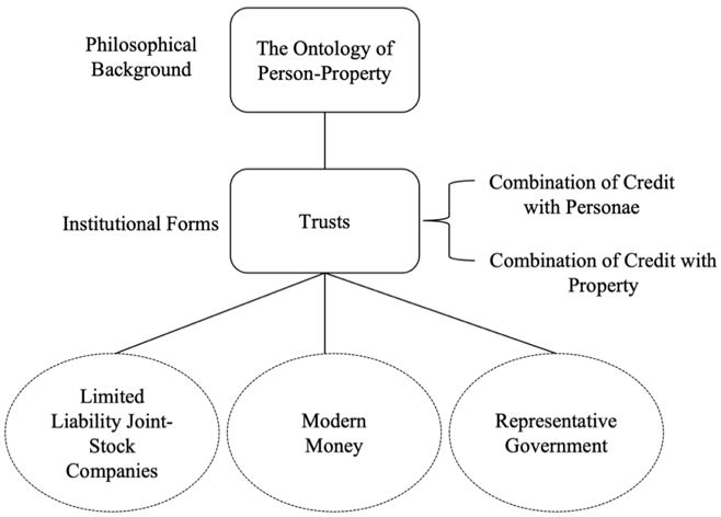 아래 그림은 이 책에서 논의하는 주요 개념을 요약한 것이다. 인격-재산 존재론(The ontology of person-property)은 신탁의 철학적 배경을 형성하며, 결과적으론 세 가지 자본주의 제도를 포괄한다.