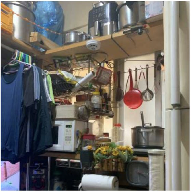쪽방은 실내에서 방안의 전경을 다 담을 수 없을 만큼 사방이 매우 좁다. 그림2는 필자가 현지 조사를 하던 기간동안 살고 있던 쪽방 건물에 같이 살던 주민 B 씨 (남, 60세) 방의 일부로 설문조사 후 그의 동의를 얻어 촬영한 것이다. 동자동에 30년 이상 거주하고 있는 B 씨는 이 방에서만 20년 이상 살고 있었다. 그의 2평 남짓한 방안에는 일반 가정에서 사용하는 크기의 냉장고, 전자레인지, 에어프라이어, 각종 조리도구 등을 모두 갖추고 있었다. 그는 자랑스럽게 본인은 하루 세 끼를 다 방에서 해 먹는다며 냉장고를 열어 필자에게 깔끔하게 정리된 본인이 직접 만든 밑반찬을 보여주었다. 사진을 얼핏 보면 정리 정돈이 안 된 것 같이 보이지만, 잘 살펴보면 제한된 공간에서 모든 것이 매우 깔끔하게 각자의 자리를 잡고 있다. 사진에는 다 나오지 못했지만, 사진 좌측에 나온 옷걸이 밑으로는 티브이와 컴퓨터가 자리 잡고 있었고, 필자가 반대편 벽에 붙어 이 사진을 찍으려고 서 있던 곳은 B 씨 이불을 깔고 자는 공간이었다. 즉, B 씨의 2평의 방 안에 일반 가정의 침실, 거실, 부엌이 다 집약된 것이다.
