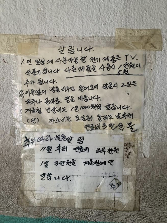 쪽방이라는 물리적 환경뿐만 아니라 쪽방의 운영 시스템 역시 주민들의 에너지 사용량을 제한한다. 그림 3은 필자가 찍은 동자동의 한 쪽방의 계단에 붙어 있던 공고문으로 “1인 일 실에 사용가능한 전기제품은 TV 선풍기입니다. 다른 제품 사용 시 1만 5천원이 추가됩니다.”라고 적혀있다. 쪽방 건물을 돌아다니다 보면 이와 비슷한 공고문을 심심치 않게 볼 수 있다. 많은 쪽방 주인/관리인들은 온수나 난방 설비가 되어 있어도 아예 틀어주지 않거나 매우 제한적으로 틀어준다. 공고문이 붙은 쪽방 역시 난방비와 따로 받았지만 제한적으로 틀어주었다. 이 외에도 주민이 자비를 들여 세탁기를 들여와서 공동으로 사용하거나 에어컨을 설치하고 싶어도 주인/관리인이 반대하여 사용하지 못하는 경우도 여럿 있었다. 방값을 내고도 냉난방은 물론 사용할 수 있는 전기제품의 항목까지 제약을 받고 있는 것이다.