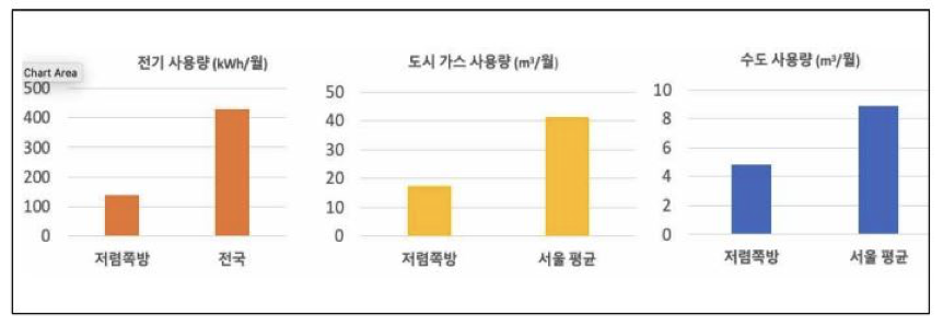 먼저, 쪽방촌 주민들의 에너지 사용량을 항목별로 살펴보면, 한국 1인 평균 에너지 소비량보다 낮은 것을 볼 수 있다. 조사 대상이었던 서울역 쪽방촌의 저렴 쪽방 건물 네 곳의 전기, 가스, 수도 사용량을 총거주민 수로 나누어 계산한 결과 각 항목 모두 한국의 1인 평균의 3분의 1 수준인 것으로 나타났다 (그림 1). 구체적으로, 전기의 경우 저렴 쪽방의 월평균 전기 사용량은 140kWh로 전국 기준 1인 가구의 사용량 428kWh에 비해 3배 정도 낮았고, 저렴 쪽방의 월평균 도시가스 사용량은 17.33㎥로 서울 1인 가구의 한 달 사용량인 41.2㎥에 비해 2.4배 정도 낮았다. 탄소발자국에는 포함되지 않지만, 수도 사용량 역시 저렴 쪽방에 거주하는 주민들의 월평균 수도사용량은 4.84㎥로 서울 1인 가구의 8.91㎥에 비해서 1.8배 낮은 것으로 나타났다.