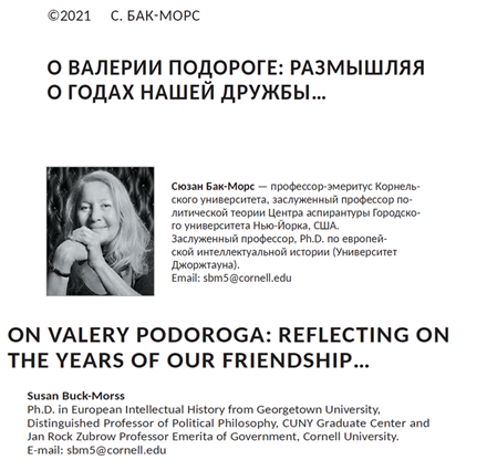 미국의 저명한 정치철학자이자 지성사 연구자인 수전 벅-모스는 2021년에 러시아과학아카데미에서 발행하는 학술지 『인간Chelovek』에 논문 한 편을 발표했다. 1년 전 사망한 러시아 철학자 발레리 포도로가 추모 특집호를 위해 쓴 그 글의 제목은 “발레리 포도로가에 대하여: 우리 우정의 세월을 되돌아보며...”였다2. 이 글에서 그녀는 자신의 학문적 여정에서 중대한 분기점을 이루었던 30여 년 전의 “우연한 만남”을 회고하면서 그 만남의 의미와 자취에 대해 숙고한다.