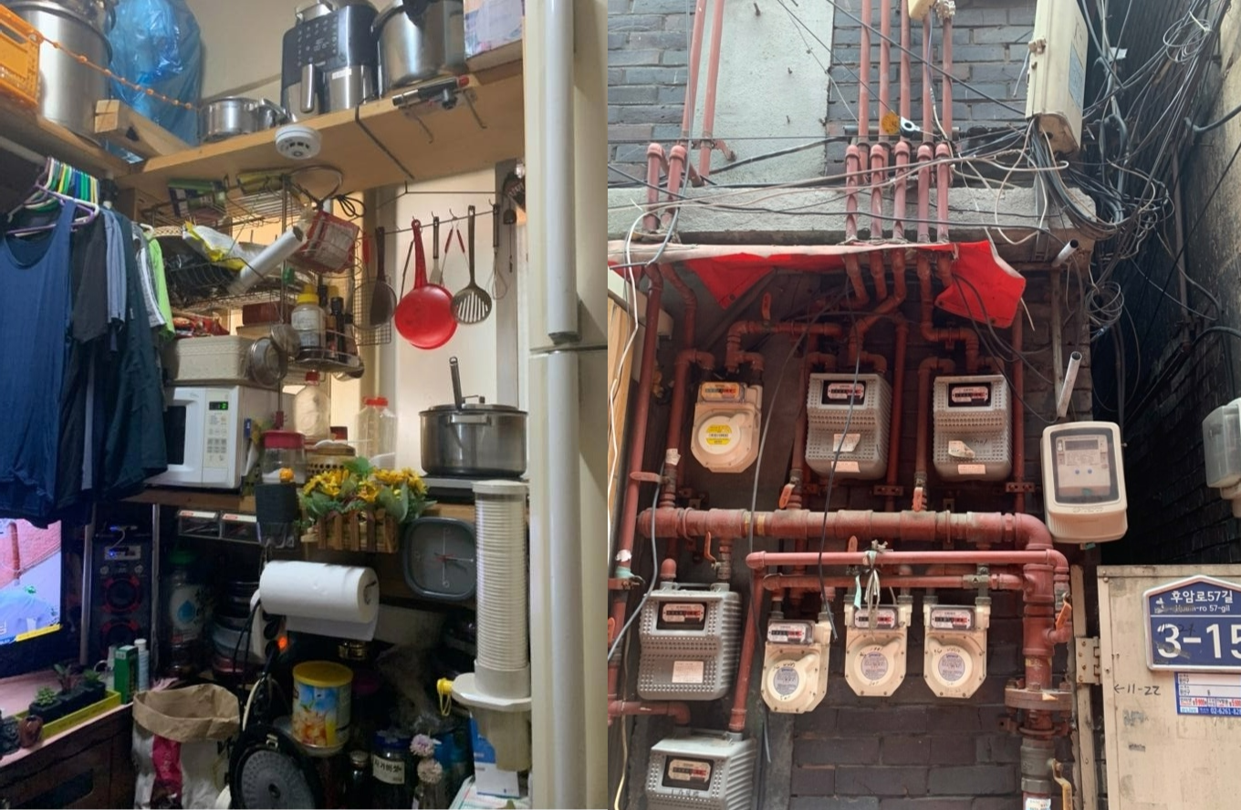 그림2. 쪽방의 좁은 방에 있는 다양한 용품들(왼쪽)과 쪽방 외부에 설치된 복잡한 전기,가스설비 (오른쪽)