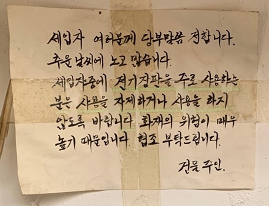 겨울 역시 마찬가지다. 앞선 글에서 언급한 것처럼 쪽방촌은 에너지 기본권 박탈 상태이다. 겨울철 대부분의 쪽방건물은 난방이나 온수를 제공하지 않거나, 보일러를 돌리더라도 추가로 요금을 받고 가장 추운 새벽 시간 등에만 몇 시간 트는 등 최소한으로 제공한다. (그림 6) 대표적인 에너지 빈곤 대응책인 에너지바우처 제도 역시 쪽방 주민들에게는 해당하지 않는다. 수급자 중에서 만 65세 이상 혹은 장애를 갖고 있어야지만 신청 대상이 될뿐더러, 이에 해당하더라도 거지주에 개별적 에너지 계량기가 설치되어 있어야 지원을 받을 수 있기 때문에, 대부분의 쪽방은 혜택을 받을 수 없다. 작년 겨울철 난방비 특별지원 대책의 일부로 쪽방에는 1,200매의 전기장판이 지급되었다. 하지만 그림 6 (아래쪽)과 같이 집주인이 전기장판 사용을 자제시키는 에너지 기본권 박탈 상태에서 이런 정책은 유명무실하다.