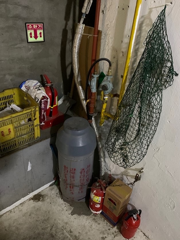 쪽방촌에는 화재 대비를 위한 물적 자원이 투여된다. 쪽방과 고시원에 화재 사건이 사회적 이슈가 되면서 2013년에 전국 쪽방촌 전기설비 개선 사업을 시행하여 3년 동안 총 4,746개 가구의 전기 설비를 전면 개보수했다. 이 외에도 쪽방에 화재경보기설치 등 화재 대비를 위한 수년에 걸쳐 여러 가지 지원이 이루어졌다. 필자가 현지 조사를 하는 기간에도 소방서에서 노후화된 소화기 교체 및 방에서 쓸 수 있는 휴대용 스프레이용 소화기가 1,000개 이상 지급되어 무료로 나누어주기도 했다. 하지만 그림 8에서 볼 수 있듯이, 이미 쪽방촌에는 소화기가 충분히 지급되어 있다. 이 사진은 필자가 소화기 교체 활동을 함께 나갔을 때 찍은 것으로 LPG 가스 옆에 소화기가 4개 있는 것을 볼 수 있다. 소화기 한 개는 아예 박스채 미개봉상태로 비치된 것을 볼 수 있다.