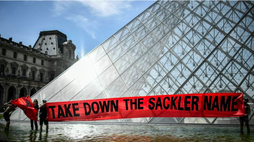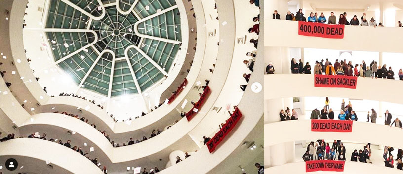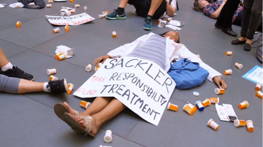 영화의 첫 컷은 메트로폴리탄뮤지엄 앞에서 약병을 챙기는 사람들을 보여준다. 이들은 곧 “The Sackler Wing”이라 적힌 유리문을 통과한다. 이들이 함께 박물관으로 들어가는 이유는 관람이 아닌 투쟁이다. 밖에서 챙긴 약병을 박물관 내의 분수대에 던지고, “새클러가 거짓을 팔고 사람들은 죽는다”라고 연호하며 이들은 마치 죽은 사람처럼 땅에 눕는다. 이들이 바로 낸 골딘과 함께 하는 P.A.I.N.(Prescription Addiction Intervention Now) 회원들이다. 낸 골딘은 새클러 가문에서 판매하는 오피오이드(Opioid) 계열의 옥시콘틴(OxyContin, oxycodone)의 피해자이자 생존자이다. 낸과 함께 하는 이들은 옥시콘틴으로 인해 가족·친구·연인을 잃은 사람들 또는 생존자 자신이다. 옥시콘틴은 새클러 가문이 소유한 제약회사 퍼듀파마(Purdue Pharma)에서 1995년부터 판매한 마약성 진통제이다. 공격적인 퍼듀파마의 마케팅과 로비로 인해 미국에서는 의사들의 옥시콘틴 남용이 빈번해졌다. 시판 얼마 후에는 베스트셀러 약품인 비아그라 판매수치를 넘어섰다고 한다. 12008년 사망한 영화배우 히스 레저도 옥시콘틴 약물의 희생자로 알려진 바 있다. 중독성이 강한 이 약품은 미국에서도 중독자가 2019년도 기준으로 250여만 명에 달한다. 반면 새클러 가문은 옥시콘틴을 팔아 사람들은 죽인 돈으로 메트로폴리탄뮤지엄, 구겐하임뮤지엄, 브루클린뮤지엄, 보스턴하버드대뮤지엄, 워싱턴D.C.스미소니언뮤지언, 파리 루브르뮤지엄, 런던 브리티시뮤지엄 등에 거대한 기부를 할 정도의 거대한 세력이 되었다.