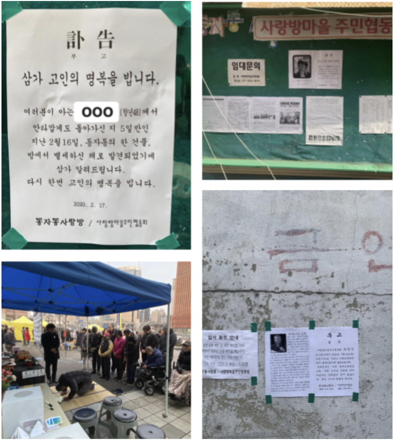 내가 현지 조사를 하던 2020년으로 코로나19가 확산하던 첫해였다. 당시 코로나19로 사망한 국민의 수가 40명이 갓 넘었는데, 이미 국가적 재난적 상황으로 인식되고 있었다. 하지만 주민이 불과 1,000명 정도인 동자동에서는 매년 평균적으로 20에서 30명 사이의 주민들이 방에서 죽음을 맞이한다. 이렇게 부고는 쪽방촌에 죽음이 가까이 있음을, 일상이 재난임을 알려준다.