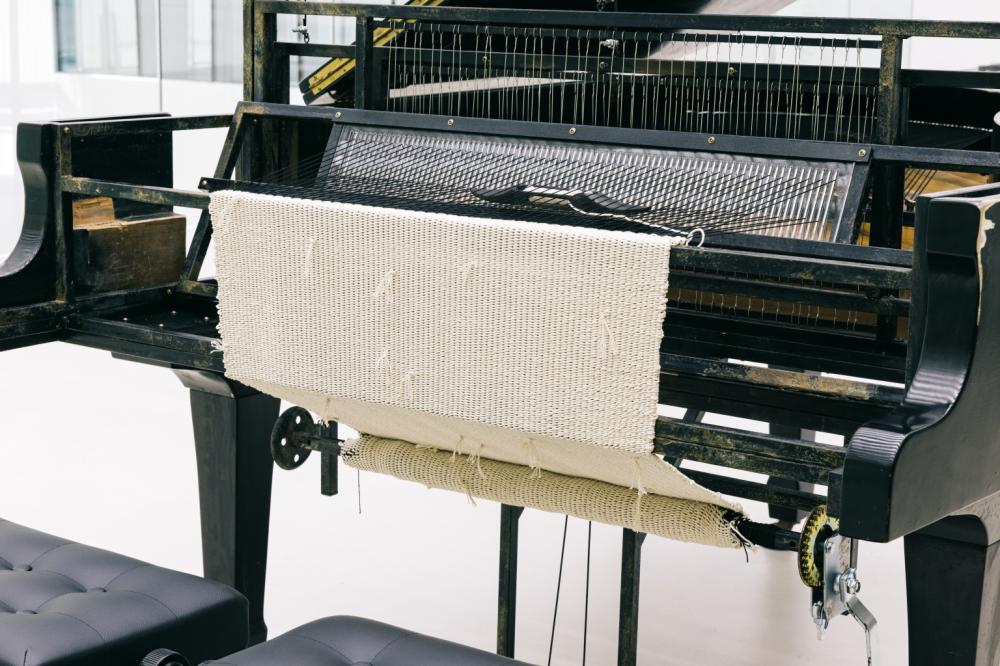 미술관 2층에는 88개의 건반을 떼어낸 피아노로 만든 직조기가 있다. 퍼포먼스의 제목이 <폐허의 잔해로 직조한 시>인 만큼 퍼포먼서는 직조라는 행위를 하고, 그 재료는 ‘폐허의 잔해’인 말과 시간이다. 작가와 구술자는 보이지 않는 말을 보이도록 하기 위해, 88개의 실을 연결하여 재난 이야기가 연결되는 상황을 연출했다. 알고 있듯이 말은 보이지 않기 때문에 말을 연결할 테두리가 필요했다. 피아노 직조기가 직물을 만들어내는 시간 동안, 우리는 여기에서 같은 이야기를 나누는 다양한 것의 묶음이 되는 것이다.