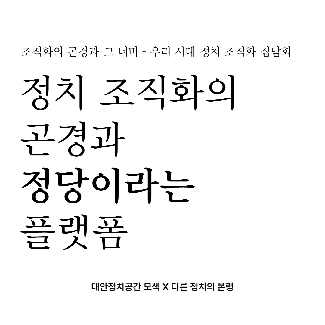 이 글은 3월 29일 토요일 오후에 진행된 「조직화의 곤경과 그 너머 - 우리 시대의 정치 조직화 집담회」 1회차 집담회의 기록입니다. 이번 집담회는 대안정치공간 모색과 다정본(다른 정치의 본령)이 공동으로 주최했으며, 두 단체가 함께 연재한 〈녹색당 12년의 실험과 가능성의 기록〉의 후속 기획으로 마련되었습니다.
