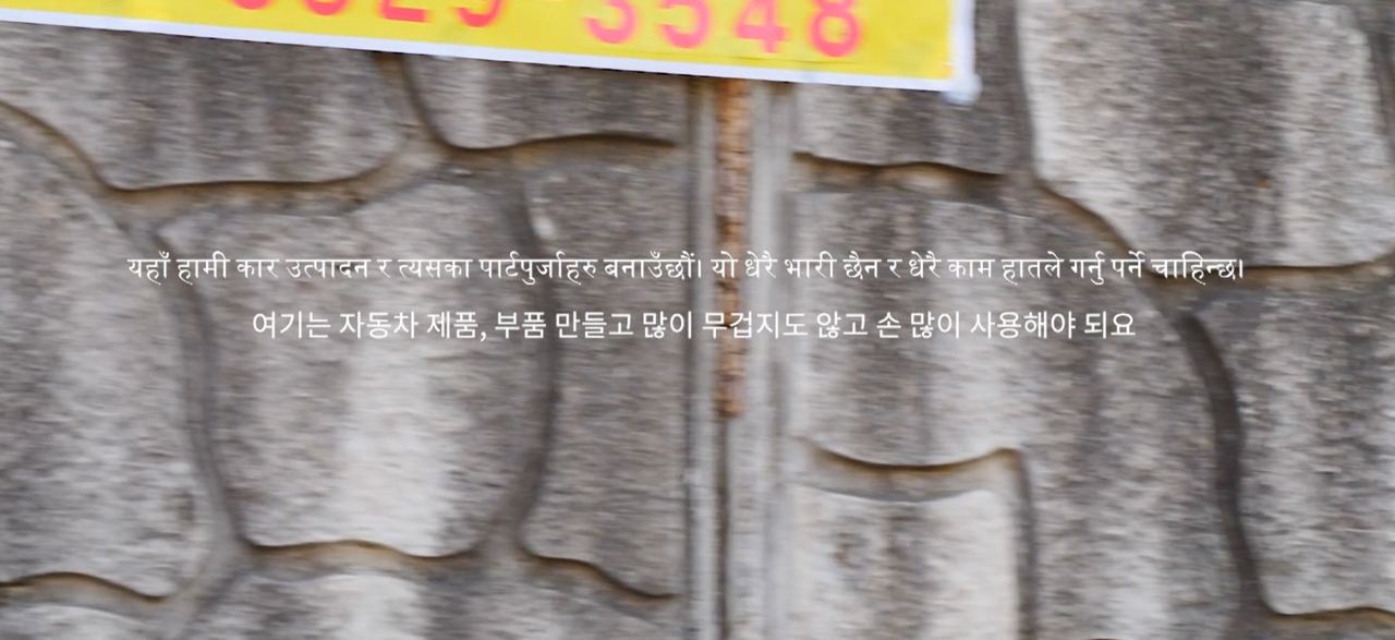 “제가 한국에 온지는 8년 되었고 지금 8년 계속 프레스 공장에서 일하고 있습니다. 자동차 제품, 부품 만들고 많이 무겁지도 않고 손 많이 사용해야 되요. 기계 안에. 그렇게 하고 있습니다.”[3]