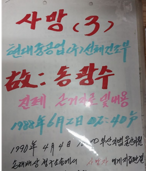 2020년 지부를 방문했을 때 지부가 갖고있는 사망사고 기록은 소위 민주파 활동가들이 노동조합 집행부로 당선된 2014년 이후의 기록이 전부라고 했다. 그 이전 자료들은 어용노조가 관련 파일을 다 없앴다고...