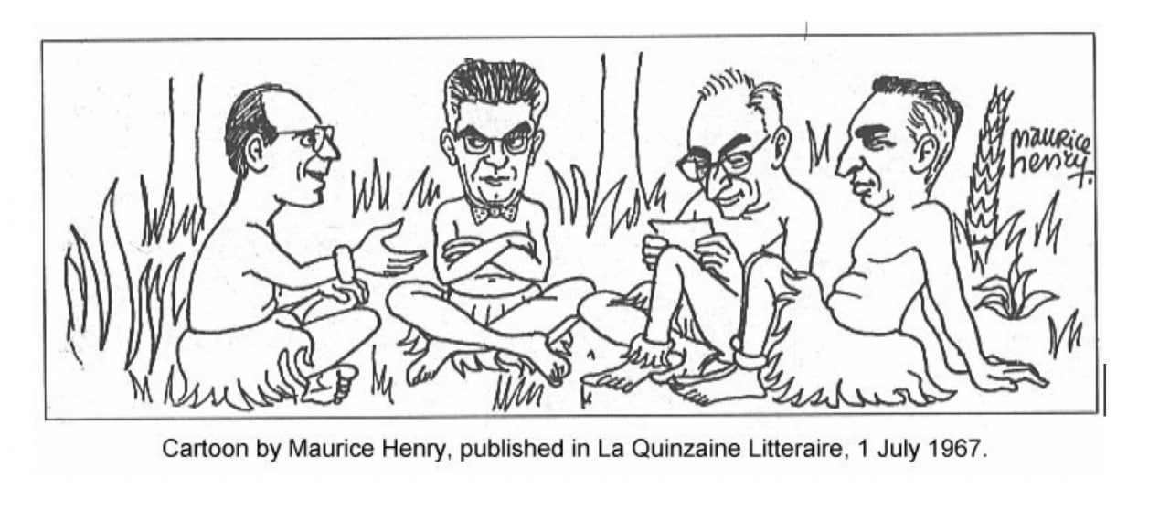 철학에서 나타난 이 기이한 거부repudiations는 인간 과학human sciences에서 되풀이되었다. 구조주의와 연관된 인간 과학의 저명한 인물들 대부분이 나중에는 구조주의를 거부했다. 롤랑 바르트는 자신의 지적 여정에서 구조주의는 스쳐 지나가는 ‘과학적 시기’(1988)였을 뿐이라고 주장했다. 자크 라캉은 구조주의를 부인했지만(2010: 14), 구조 관념idea을 포기하지는 않았다. 반세기도 더 전에 사망한 페르디낭 드 소쉬르조차 1970년대에 [구조주의가 아니라] 포스트-구조주의의 창시자로 되살아났다. 오직 클로드 레비-스트로스만이 이 관념에 충실했고, ‘구조주의자들의 점심식사(structuralist lunch)’─그 당시 모리스 앙리의 유명한 만화에서 묘사된─에 홀로 남겨졌다[옮긴이: 마니글리에는 다음 그림을 언급하고 있는 듯하다. 왼쪽부터 차례로 푸코, 라캉, 레비-스트로스, 바르트].