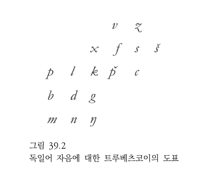 유효한[실제의] 구조주의는 차이들의 체계 내에서 정의되는 위치, 즉 구조적 동일성structural identity이라는 새로운 동일성 통념을 도입함으로써 이 문제를 해결한다. 트루베츠코이의 1939년 저작 『음운론의 원리(Principes de phonologie)』는 비표준적 의미에서의 구조에 대한 최초의 도표를 담고 있다. 독일어 자음 체계에 대한 그의 도표(그림 39.1 참고)는 이 구조적 동일성 통념을 완벽하게 예시한다(Trubetzkoy, 1969: 72).